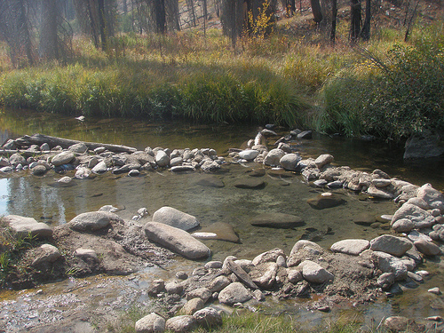 rock walled pool at the creek's edge despite it being submerged in the last of the spring run-off.