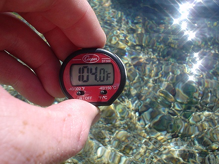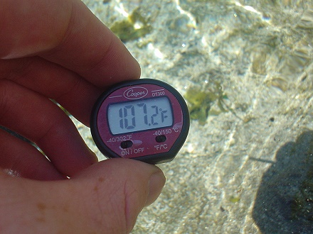 like this is. This would have been a grade A soak, had it not been for a discovery in the pool 2nd from the top. We noticed very very small 'swimmy thingies' in the clear water that were attaching themselves to our skin! Apparently the uppermost pool is too hot for those things, and was subsequently a very nice soak. When at Fire Crew we inquired about these 'swimmy things' with a local. He told us that his friend swears they are not any type of leech or anything like that, and that tons of people sit in them all the time. Other than the 'swimmy thingies' Rocky Canyon was awesome,